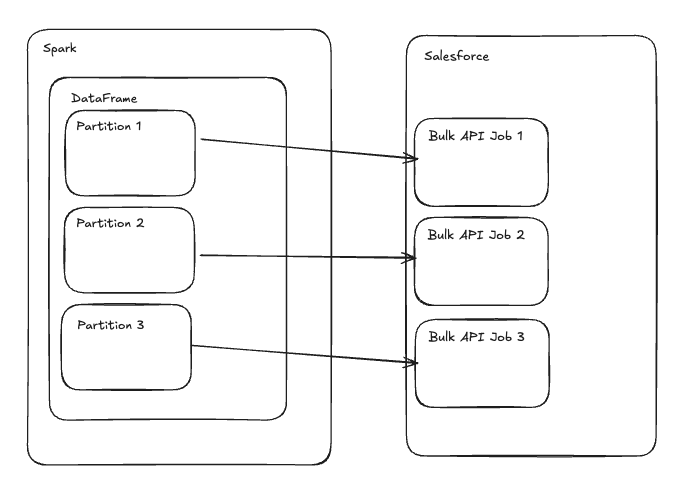 )The data_to_upload is an important array variable in this writer. To understand what it is doing, recall that write() is pickled and sent as a task for each partition in your DataFrame. This means that the rows: Iterator[Row] argument that data_to_upload is iterating over is the set of rows for one partition. This is turning each row into a key/value dict for compatibility with the Salesforce API and storing them in a Python List. It’s extremely important to recognize that creating this List of Dict objects is materializing the entire partition in the memory of your executor. This must be done, as the Salesforce API requires the full payload to be constructed before sending. If this is done on a partition that is too large, you will face Out of Memory (OOM) issues. If this is the case, logic could be added to chunk your partition, but that would mean additional Bulk API jobs and additional API calls in Salesforce.