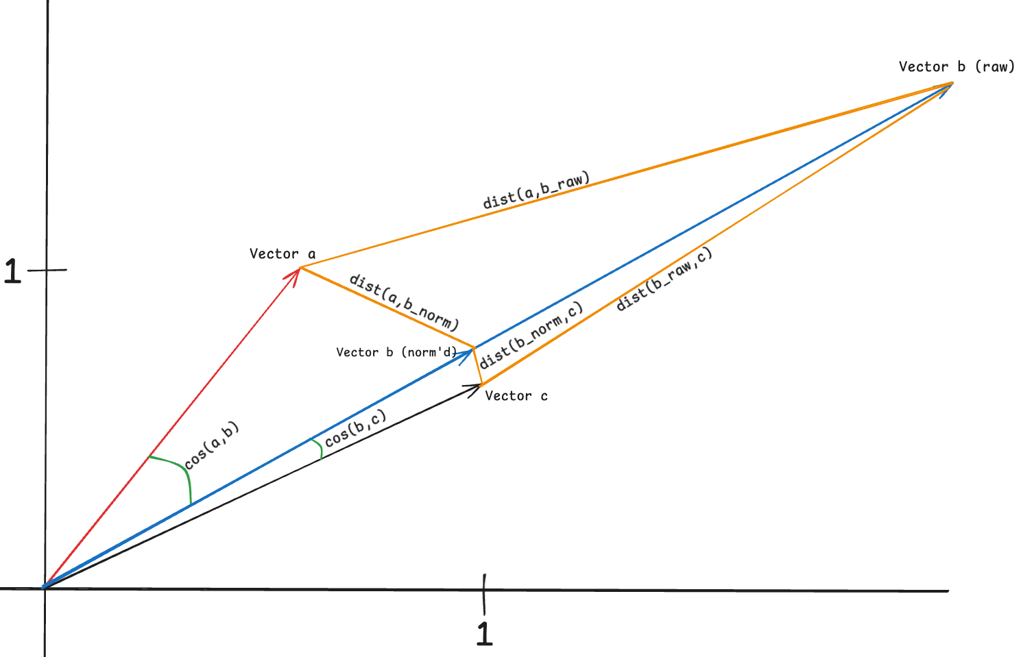 The green angles between vectors (e.g., cos(a, b) and cos(b, c)) represent cosine similarity, which depends purely on direction. In contrast, the orange segments represent Euclidean distances between vector tips — and since the Databricks score is computed as a linear transformation of the distance, these distances directly influence the similarity score.