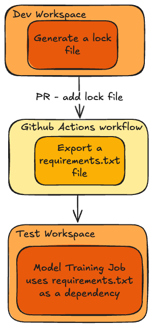 This can all be easily orchestrated using Databricks Asset Bundles and Lakeflow Jobs. By installing the requirements lock file, we can override any conflicting transitive dependencies in the DBR and ensure that the training and serving environments are the exact same. Here is an example job config: