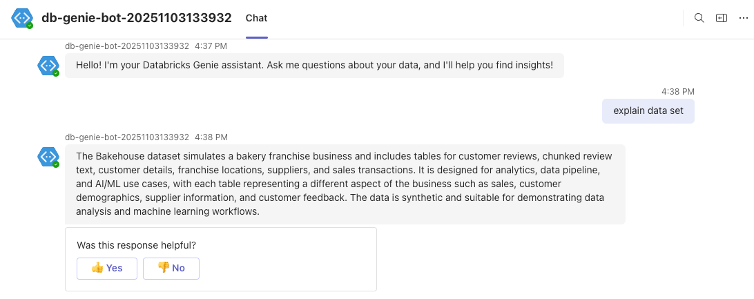 A Teams Bot that integrates with Databricks Genie using conversational APIs, allowing users to query and interact with their data directly from Teams.