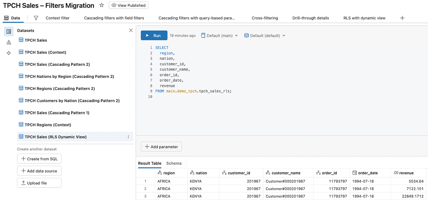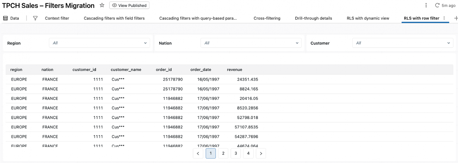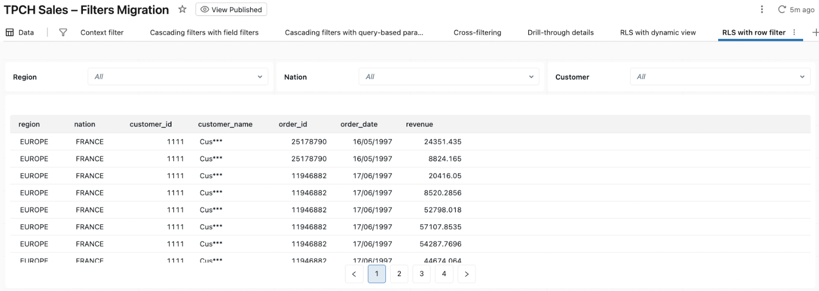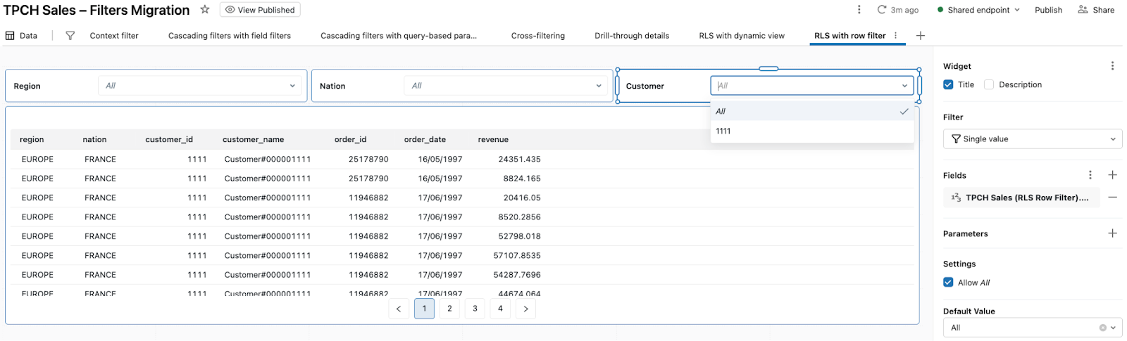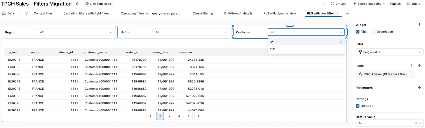 FROM main.demo_tpch.tpch_sales_table;In the companion dashboard, I created a RLS with row filter page based on this dataset: