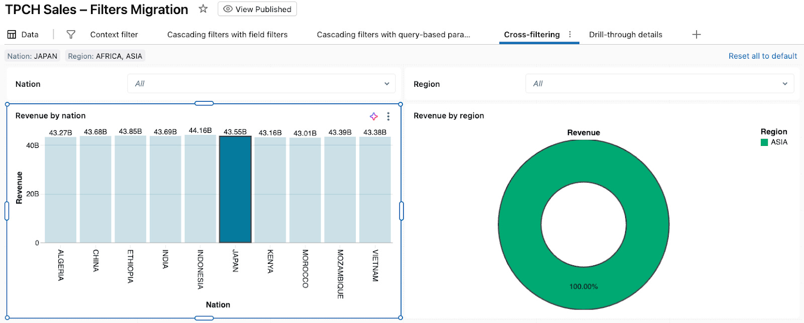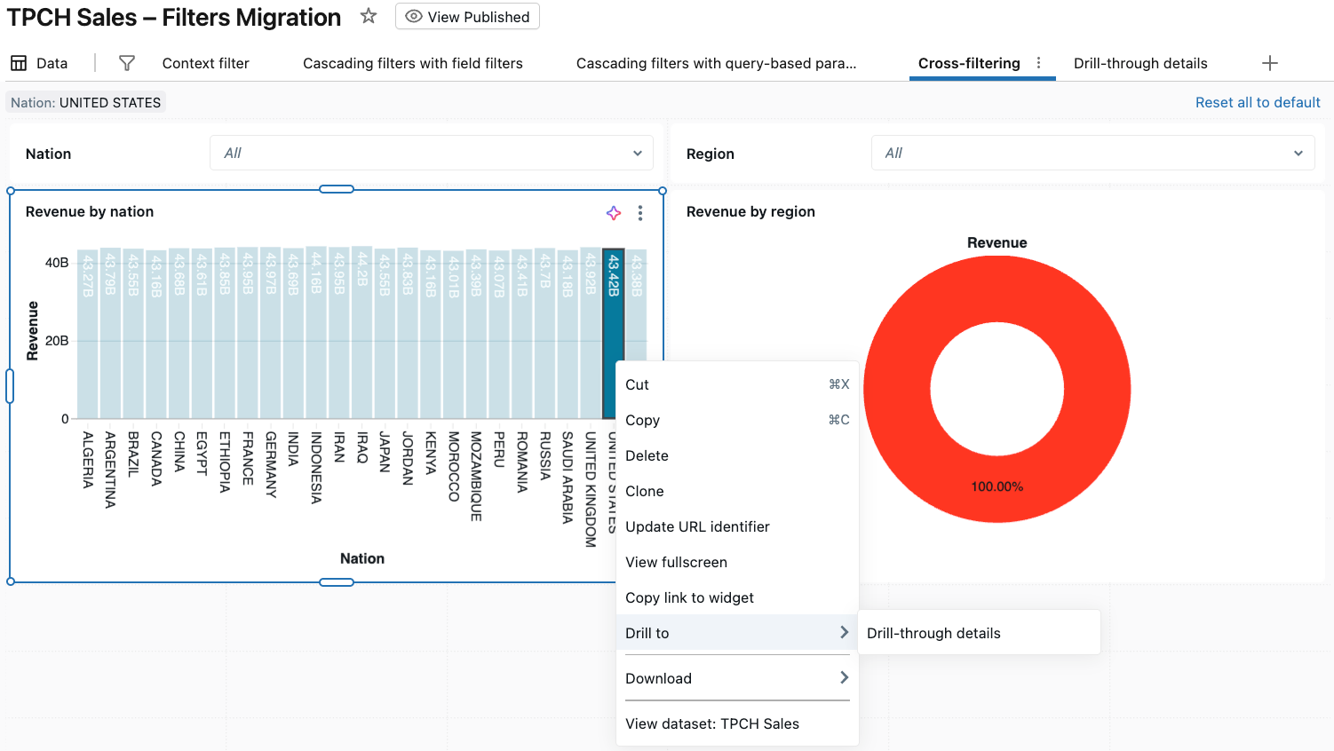 Go back to the Cross-filtering page and right-click a bar in the Revenue by nation chart (for example, UNITED STATES).