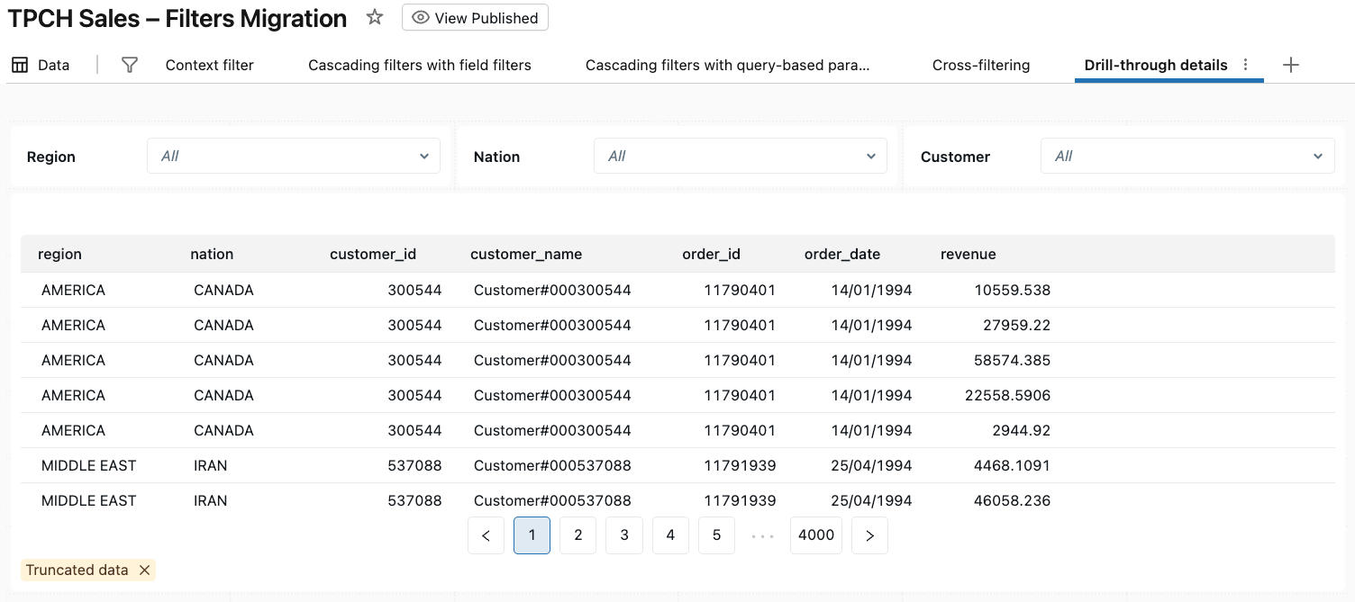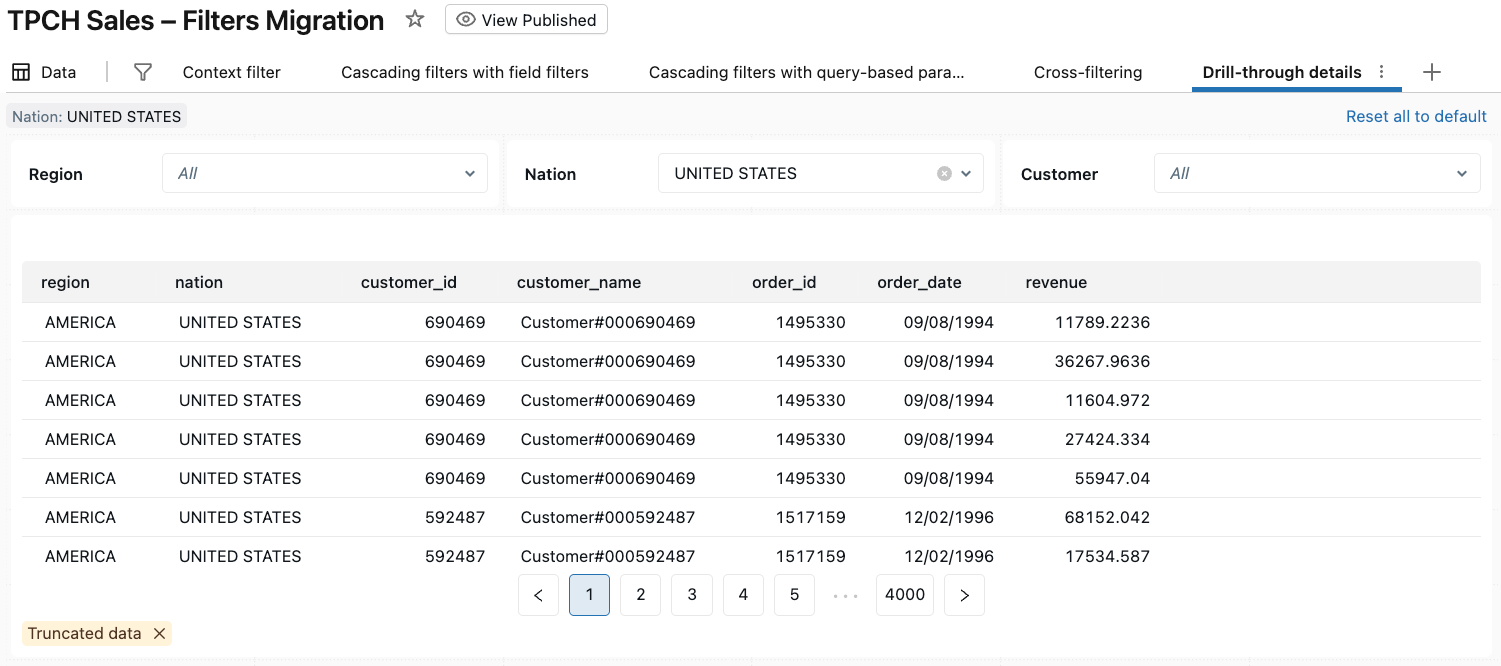 After clicking Drill to → Drill-through details, AI/BI opens the Drill-through details page and filters all visualizations based on TPCH Sales to Nation: UNITED STATES.