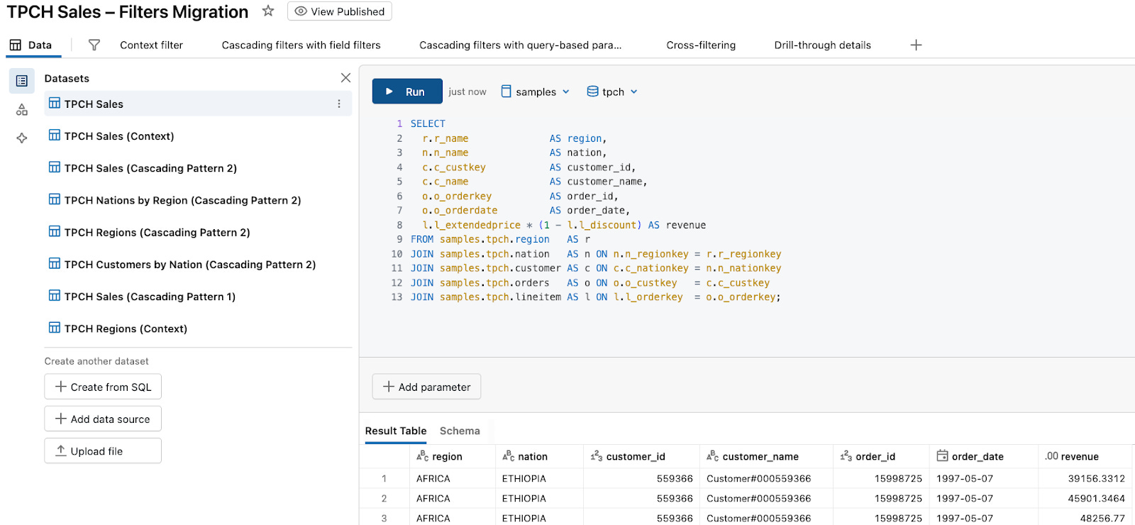 JOIN samples.tpch.lineitem AS l ON l.l_orderkey = o.o_orderkey;In the companion dashboard, this is the TPCH Sales dataset. It and its derivatives are used by multiple pages: