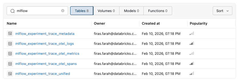 mlflow_experiment_trace_unified: a consolidated view that assembles all trace data into a single record per trace. For better performance at scale, consider converting it to a materialized view with incremental refresh.