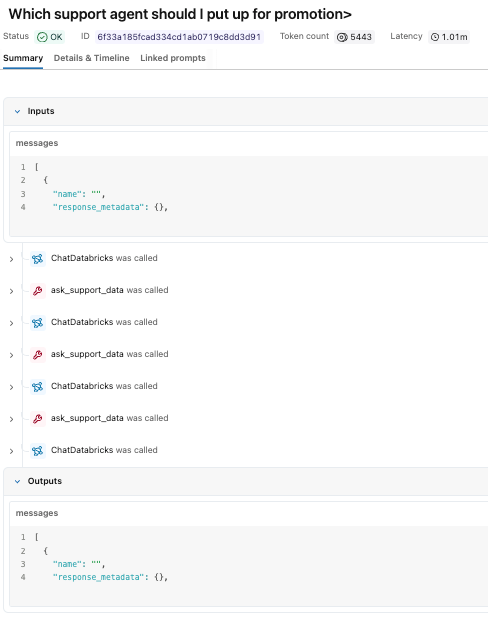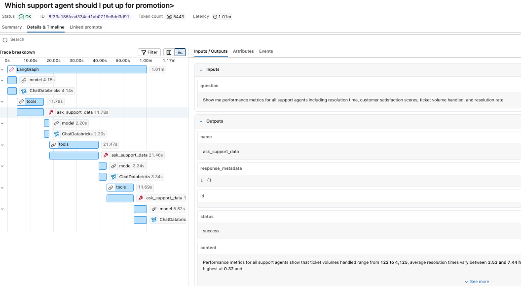 Now that the agent is instrumented and traces are flowing into Unity Catalog, let’s look at a real execution.