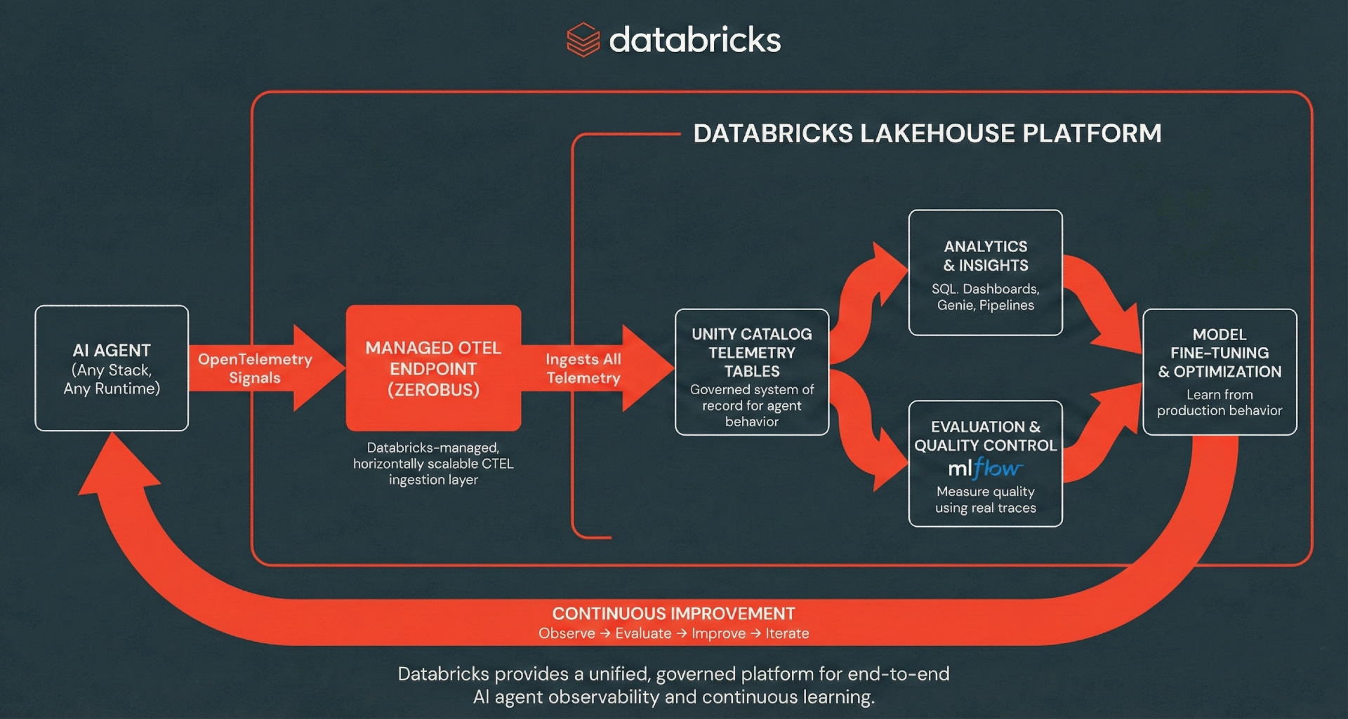 The Benefit: By landing traces directly in the Lakehouse, teams get governed, analytics-ready observability data with long-term retention, unified evaluation and monitoring workflows, and no OTEL infrastructure to operate.