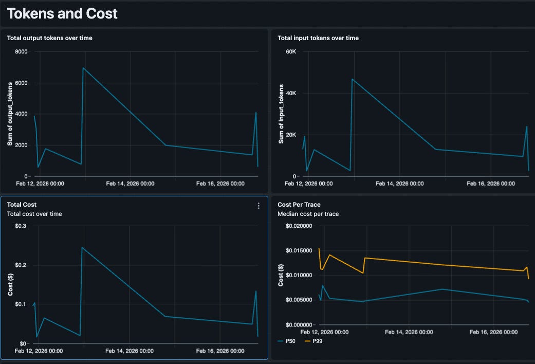 Generic “cost” metrics are rarely accurate because every team negotiates different rates or uses fine-tuned models with unique pricing. Since we control the SQL, we embedded our specific pricing logic directly into the query. Our dashboard tracks token usage by model type (e.g., GPT-4o vs. Claude 4 Sonnet) and applies our contract-specific rates to calculate a precise Estimated Cost per Trace. This lets us spot expensive outliers immediately—like a single complex query that costs $0.50 due to a retrieval loop.