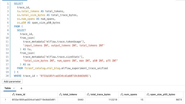 Because traces are stored as Delta tables, they can be queried like any other dataset. We can start with the mlflow_experiment_trace_unified view, where we will find a record that includes the request, response, trace metadata, and an array of the spans.