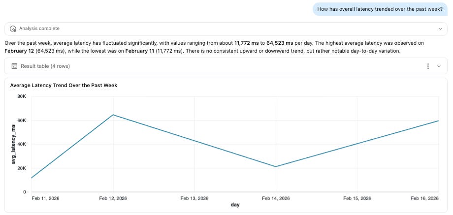 Both business and technical stakeholders often want to explore agent behavior without writing SQL. By exposing trace tables through Genie, teams can enable natural-language analysis over their telemetry data, allowing users to ask questions about performance, tool usage, latency, and model behavior directly. In our example, this could include questions such as: