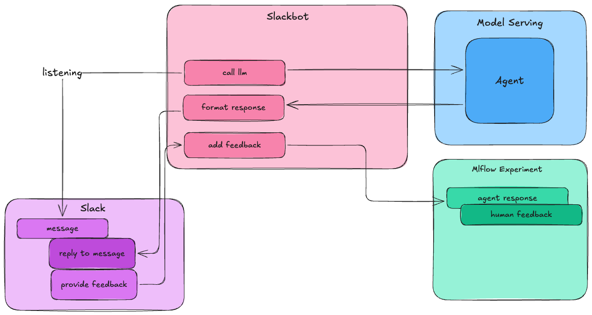 To create a Slackbot that can perform the same tasks as a custom review app, we will need to host it on a Databricks App. In this app, we are going to use labeling sessions slightly differently. Instead of interacting with pre-selected traces, we will allow SMEs to interact with the agent directly, creating traces and adding them to an already- created labeling session immediately. Then, the SME can add feedback via Slack interactions.