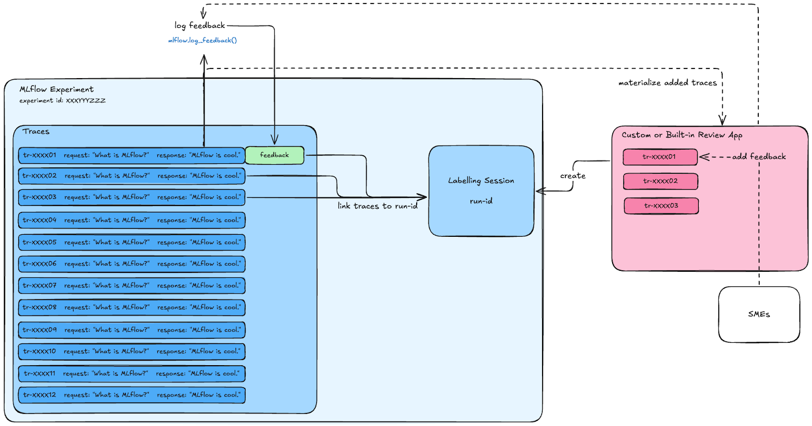 A labeling session (source: Databricks documentation) is a special type of run within MLflow. Databricks recommends adding specific traces to a labelling session beforehand-- the custom or built-in review app then connects to that labeling session and exposes the traces to SMEs. The app allows us to just interact with the MLflow client in a specific way. This requires us to pre-select traces.