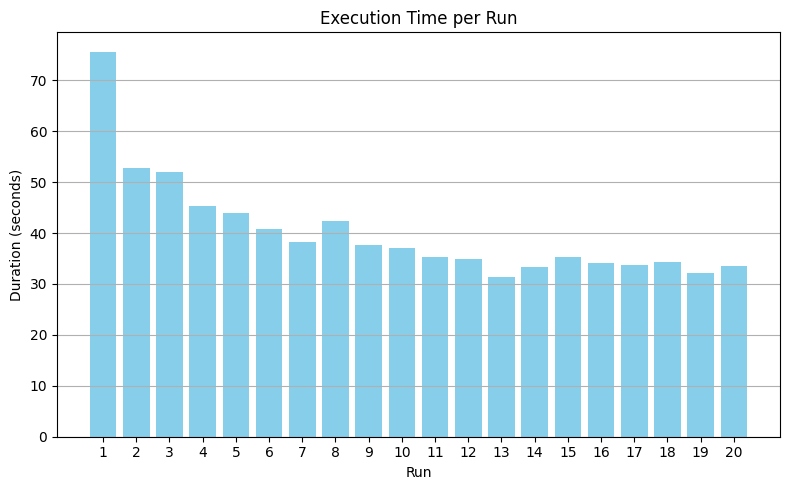 plt.show()You should see total duration drop sharply after the first run and then level off. When the bars flatten, the warehouse’s disk cache is effectively warmed, and your benchmark can begin.